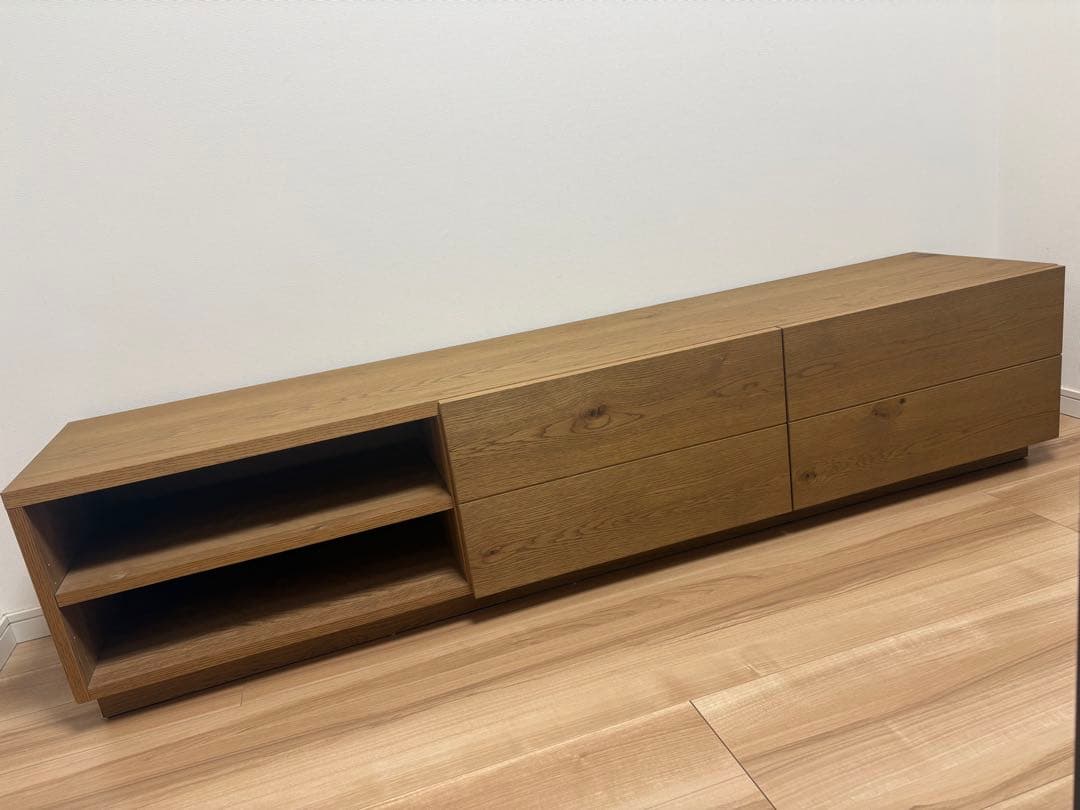 7月末で出品取り消します。約¥70000で購入後4年使用少し引き出しの締まりが緩いです。ネジを締め直すとなおるかもしれませんがそのまま出品しております。白い汚れがあります。テレビを置いた時にできたキズあります。テレビを置けば見えないとは思いますがあくまでも主観です。他にも画像みて分からない点はコメントください♪大型発送なので返品は受け付けておりません。ご納得頂けた方のみご購入ください。オークとウォルナットの美しいテレビ台、強化ガラスの引き出し付き。- サイズ: 幅200cm 奥行44cm 高さ45cm- 素材: オーク突板、プリント、ウォルナット、強化ガラス- カラー: オーク、ウォルナット- 重量: 約55kgウォルナット 木目 テレビボード テレビ台テレビ台 ローボード 幅200 国産 日本製 完成品 組み立て不要 タップ収納 テレビボード TV台 リビングボード テレビラック 収納 木製 収納棚 おしゃれ ホワイト 白 ブラック 黒 ウォールナット ブラウン 背面収納